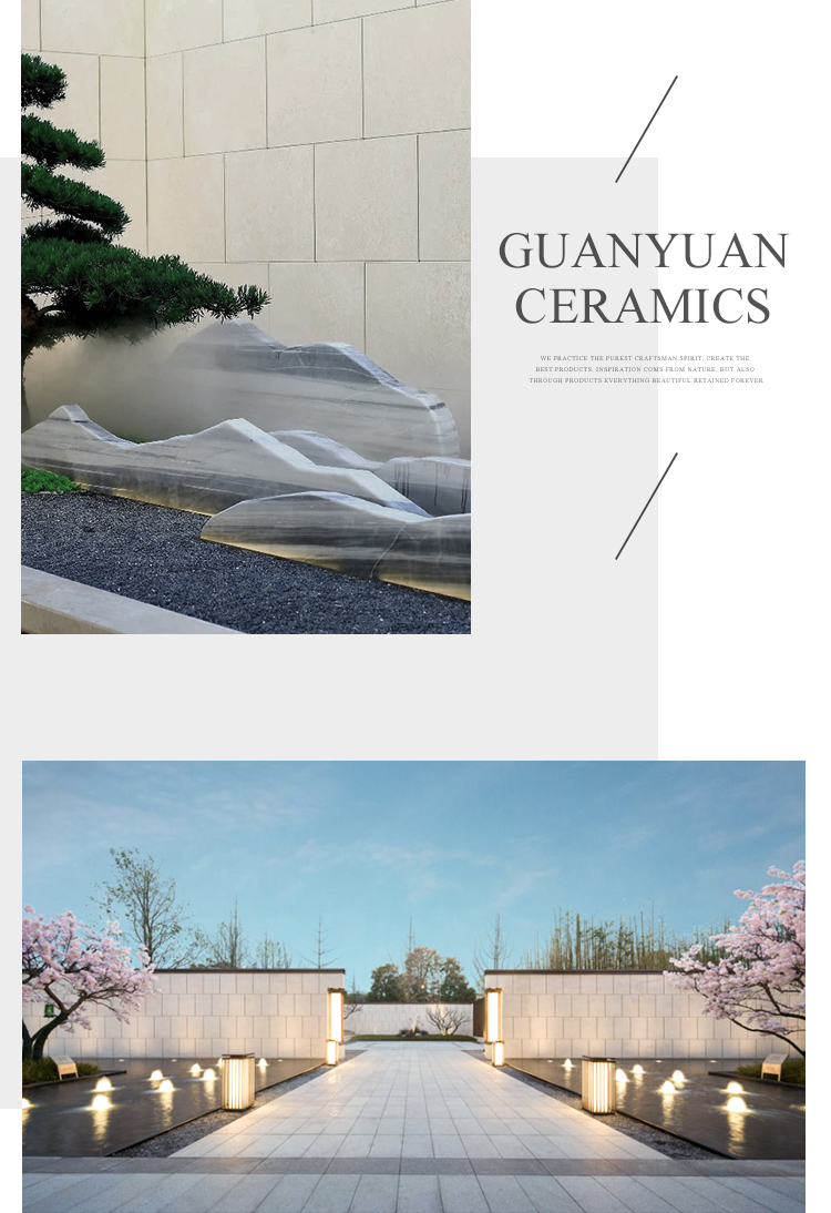走進項目,迎面便是由大片榆璧陶瓷旗下品牌冠源·沉香米黃所構(gòu)筑的立面景墻。利用景觀墻作為隔檔,有效地對整體空間進行切割,形成視覺上的隔斷,賦予了建筑良好的隱私功能。同時,直線與弧線的錯落布局既豐富視野層次,又將冷硬感與柔和感進行了完美的融合。